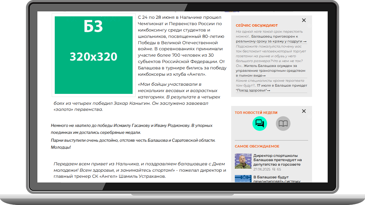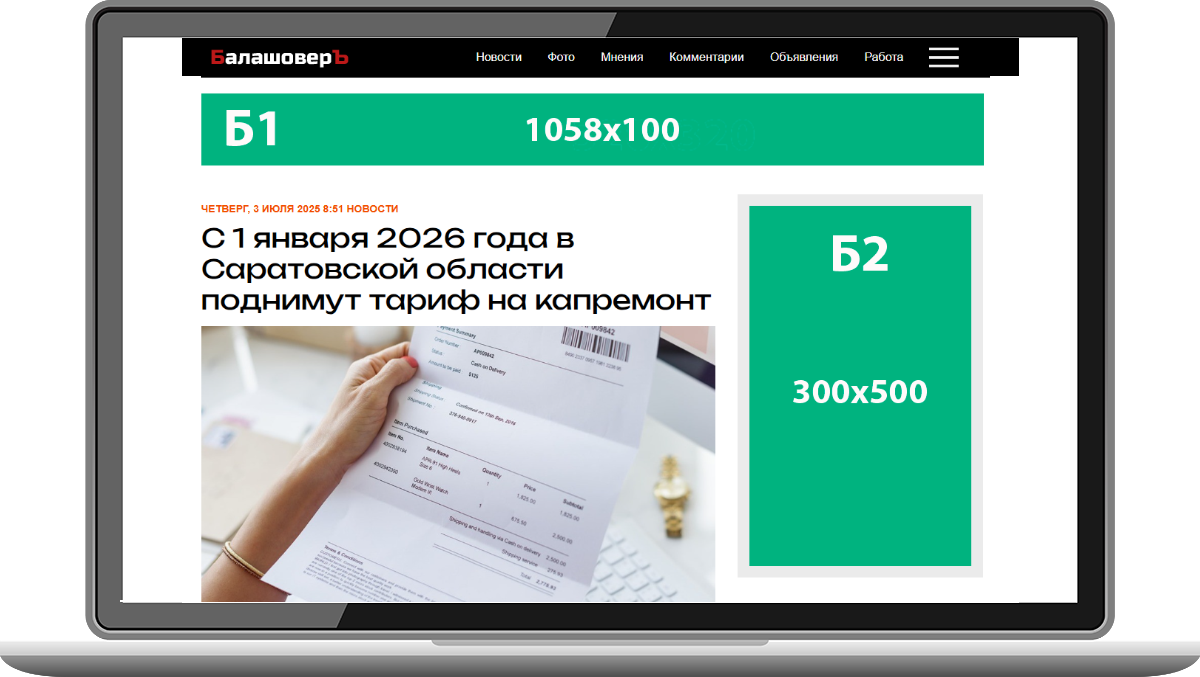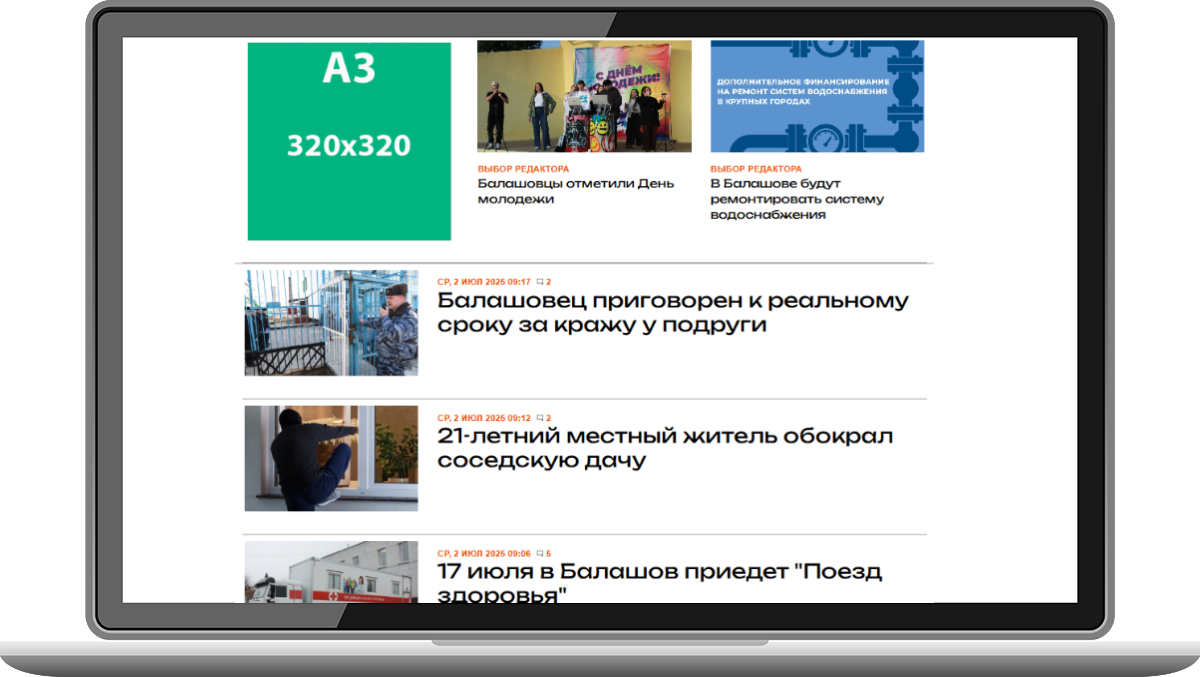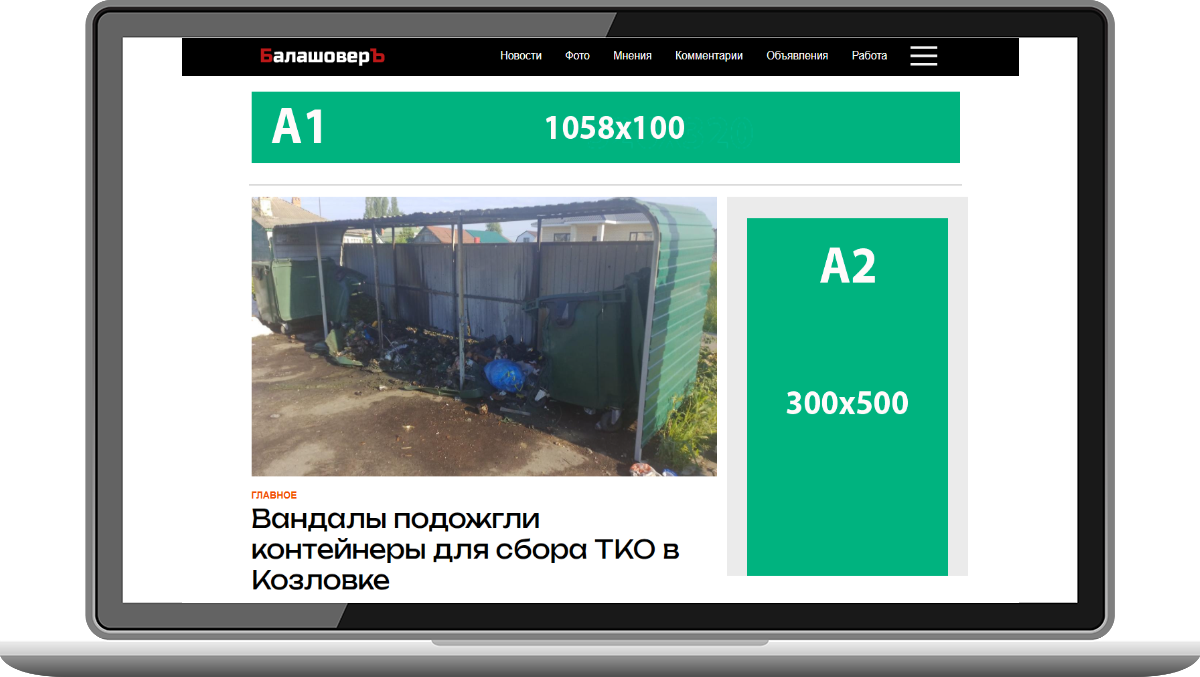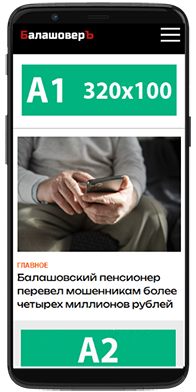 Балашовер для размещения медийных баннеров предлагает две зоны, примерно равные по количеству показов - по 250 000 - 300 000. Все баннеры имеют разные размеры при показе на десктопной версии сайта (компьютер/ноутбук) и при показе с мобильного устройства. Система сама определяет с какого устройства зашел посетитель и показывает ему соответвутющую версию баннера. Если вы покупаете определенный баннер, например А1, то ваш баннер будет показываться и в мобильной и в десктоп-версии сайта.